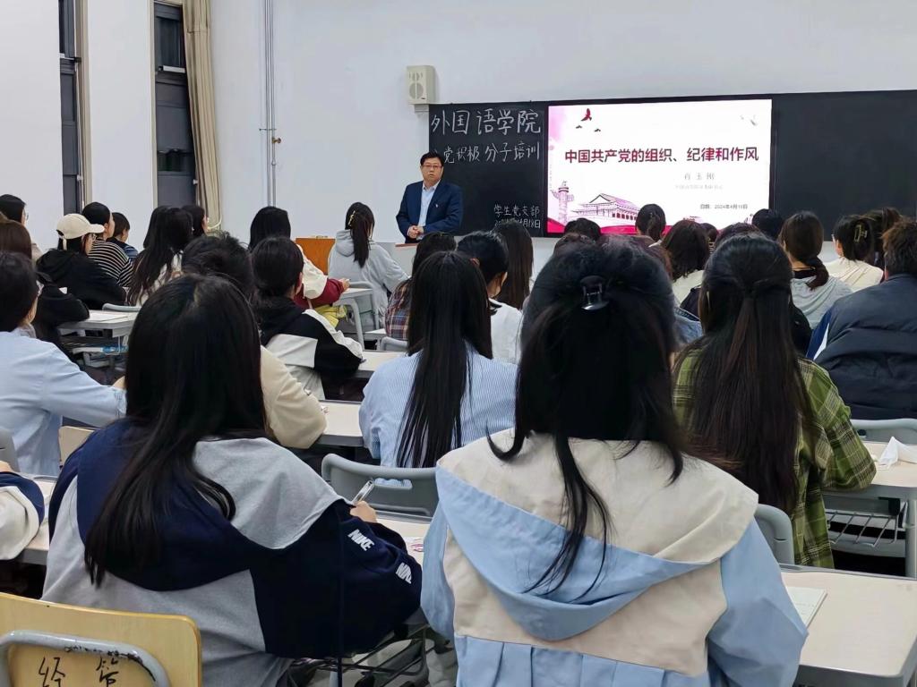 为切实提升入党积极分子的政治素养和党性修养,4月18日晚,外国语学院学生党支部在薛城校区豁然楼A112教室组织开展入党积极分子培训党课——《中国共产党的组织、纪律和作风》。本次党课由外国语学院党委副书记肖玉刚主讲,本期入党积极分子参加了此次培训。