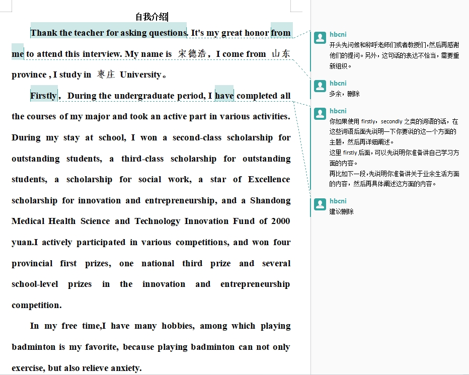 学院组织了全体专任教师为学生修改自我介绍、个人简历以及相关的专业知识问答(英语、日语、俄语)等。指导教师从语法知识点、表述规范性、行文流畅度、逻辑严密性等重要环节,对学生所提交的文字版复试材料进行了认真审阅、逐一修改,对学生复试外语环节提出了中肯建议。