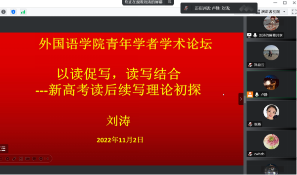 11月2日下午,外国语学院举办第四期“青年学者学术论坛”。此次论坛采取线上方式进行。学院刘涛副教授、博士作了题为“以读促写,读写结合—新高考读后续写理论初探”的学术报告,全体专任教师和部分学生参加了本次学术论坛。