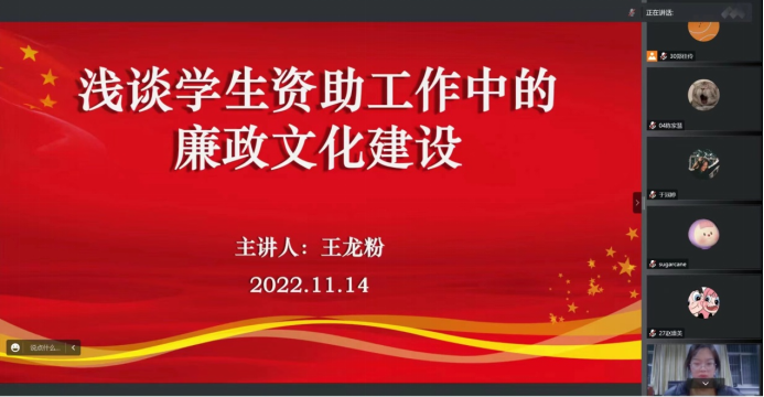 为进一步弘扬廉政文化,树立廉洁理念,推动廉政文化向纵深发展,11月14日晚,外国语学院通过“腾讯会议”网络平台举办廉政文化建设主题讲座。本次讲座由外国语学院专职辅导员王龙粉主讲,我院400余名学生聆听了此次讲座。