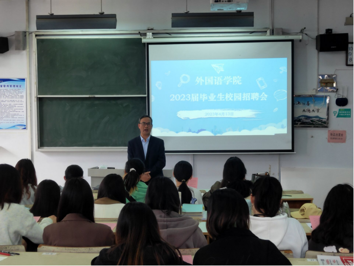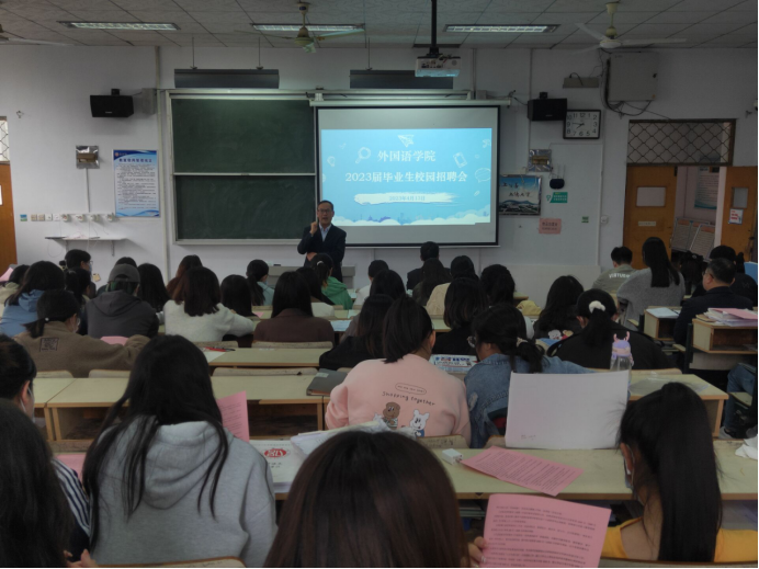为促进学院2023届毕业生充分就业,为学生提供更多的就业机会,4月13日下午,外国语学院邀请枣庄八中原校长姜德仁在文科楼117教室举办外国语学院2023届毕业生校园招聘会。外国语学院党总支书记盛清银、副院长孙显云、全体辅导员和2023届毕业生到场参会。