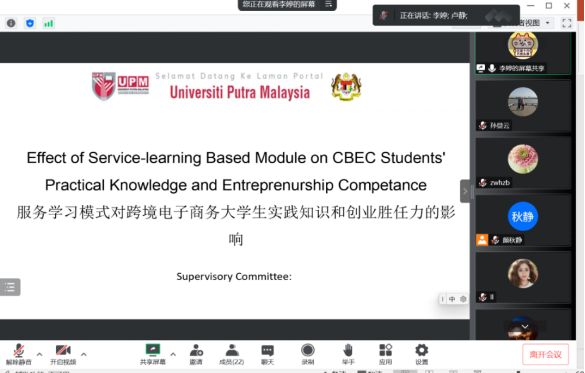 11月9日下午,外国语学院举办第五期“青年学者学术论坛”。此次论坛采取线上方式进行。青年教师、马来西亚理工大学在读博士李婷作了题为“服务学习模式对跨境电子商务大学生实践知识和创业胜任力的影响”的学术报告,全体专任教师和部分学生参加了本次学术论坛。