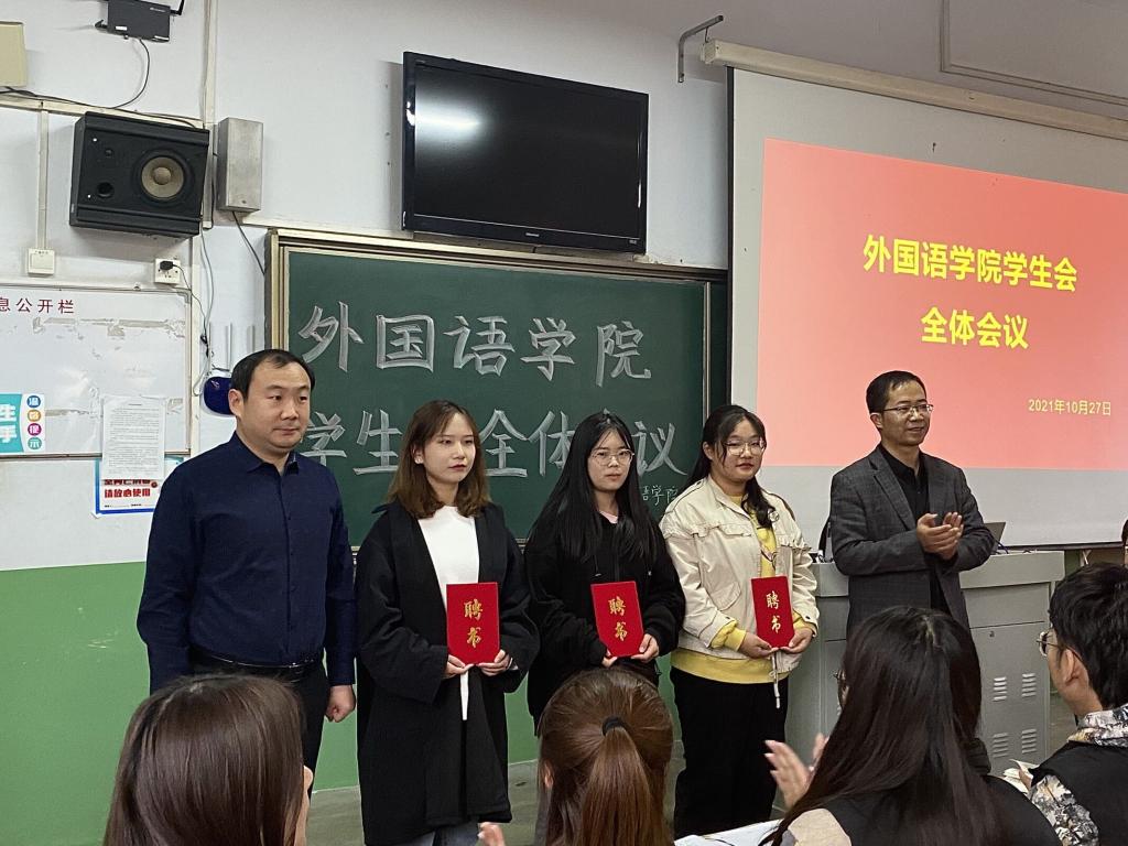 会上,张婷宣读了外国语学院2021届学生会、自律会干部名单。学院领导依次为新一届学生会干部颁发聘书并合影留念。随后,外国语学院2020届自律会主席石旭发言,对过去一年的学生会和自律会工作进行了总结,同时希望新一届学生会成员继续发扬优良传统,充分发挥学生会的桥梁与纽带作用,做好本职工作。2021届学生会主席董辰雨、自律会主席孙君奇依次发言,对上一届学生会做出的贡献表示感谢,并承诺将不辜负老师和同学们的信任,带领新一届学生骨干充分发挥学生组织的作用,开拓创新,再创辉煌。