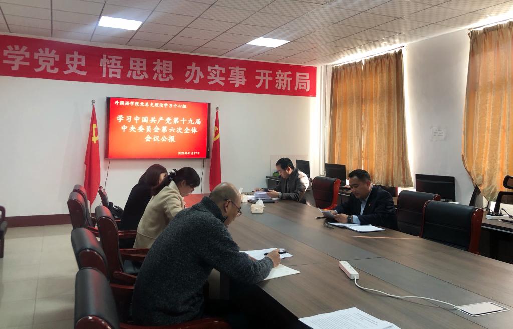 11月17日,外国语学院党总支理论学习中心组在文科楼309会议室召开党的十九届六中全会精神专题学习会,就《中国共产党第十九届中央委员会第六次全体会议公报》开展集体学习研讨活动。会议由学院党总支书记盛清银主持,外国语学院党总支理论学习中心组成员参加了学习研讨活动。