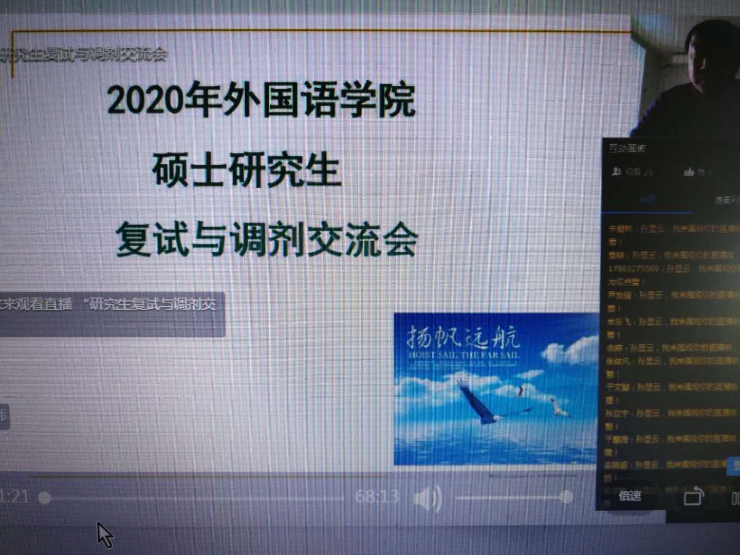 3月30日下午,外国语学院举办硕士研究生入学复试与调剂线上专题辅导报告会,共有初试成绩有望过线的80余名毕业生参加,辅导报告由外国语学院副教授、博士孙显云老师主讲。