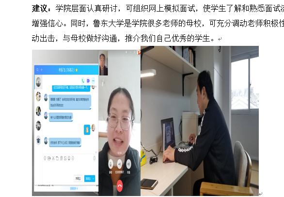 为期一周的考研复试“一对一”指导工作的开展,帮助学生明确了努力目标和方向,提升了能力,增强了自信。按照考研复试指导工作实施方案的要求,指导教师会随时与学生保持联系,掌握学生的动态情况,及时帮助他们解决相关问题。下一步外国语学院还将组织学生开展线上复试模拟演练,进一步帮助学生掌握线上复试的流程和技巧,努力提高考研复试通过率。