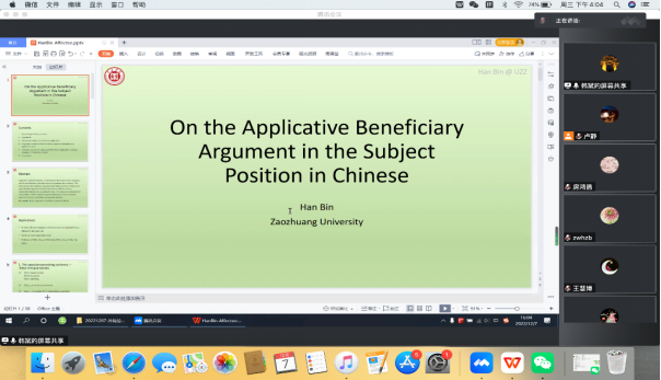 12月7日下午,外国语学院举办第九期“青年学者学术论坛”。此次论坛采取线上方式进行。我院副教授韩斌博士作了题为“汉语主语施用论元结构研究”的学术报告,全体专任教师参加了本次学术论坛。
