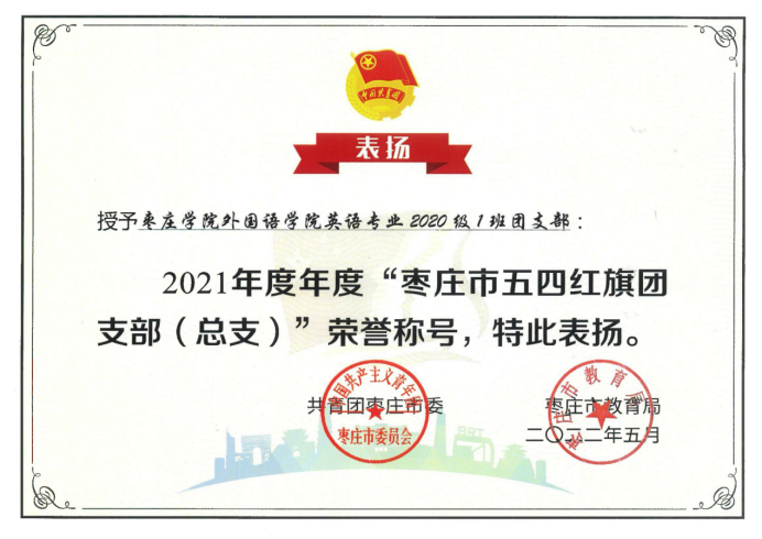 2020级英语本科一班团支部成立于2020年9月,现有中共预备党员2名,团员23名,其中19名同学积极向党组织提交入党积极分子申请,12名同学已被确定为入党积极分子,多人获评“优秀学生干部”“优秀学生”“优秀团员”等荣誉称号。自成立以来,支部始终坚持以习近平新时代中国特色社会主义思想为指导,深刻领悟“两个确立”的决定性意义,进一步增强“四个意识”、坚定“四个自信”、做到“两个维护”,听党话、跟党走、感党恩,支部成员集体观念强,参与活动的积极性高,营造了良好的班风、学风,发挥了团支部的战斗堡垒作用,连续两次被评选为校级“五四优秀团支部”,2022年获评“2021年度枣庄市五四红旗团支部”“今年会2022年度最具活力团支部"。