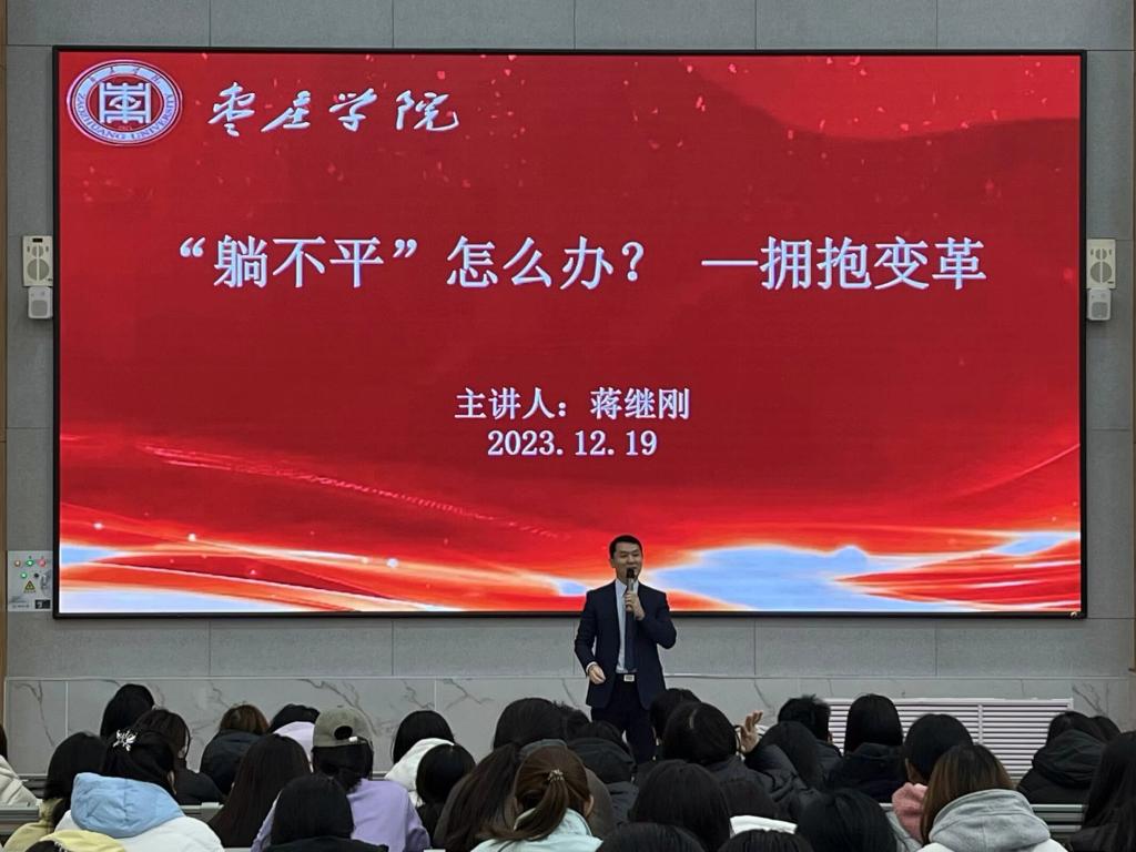 本次报告会以《躺不平怎么办?—拥抱变革》为主题,从内在因素、外部条件、正确拥抱生活等方面展开。蒋继刚分享了自己大学的学习经历以及毕业后的奋斗历程,从思想动态、专业学习、社会实践、就业求职和知恩感恩五个方面与在校学生进行了交流。他激励同学们要自信自强,努力放飞青春梦想、实现自我价值。鼓励同学们在大学期间要做好职业生涯规划、树立明确的学习和奋斗目标,保持自信和活力,不断强化科学文化知识的学习,切实有效提升综合素质,为将来走向社会奠定扎实的基础。